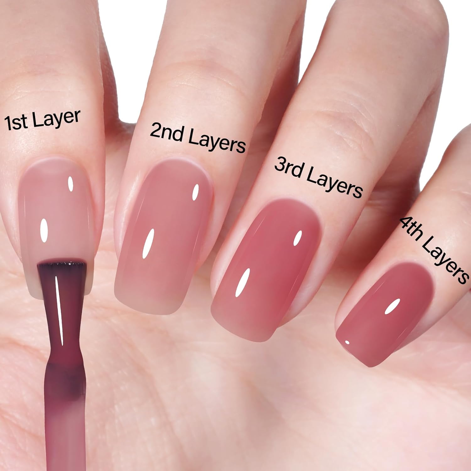 Jelly Feeling Nude Gel Nail Polish: AILLSA pink gel polish has a semi-transparent color, you can adjust the depth of the color according to your preference, the more layers you apply the deeper the color becomes and goes from sheer to opaque. *The color of the gel nail polish will also vary slightly depending on the of the nail bed color.