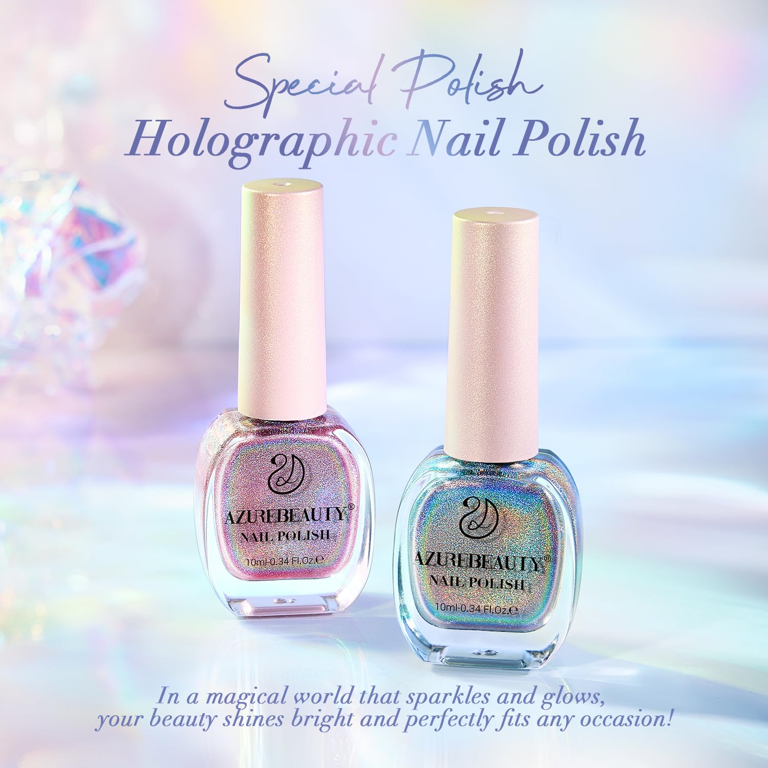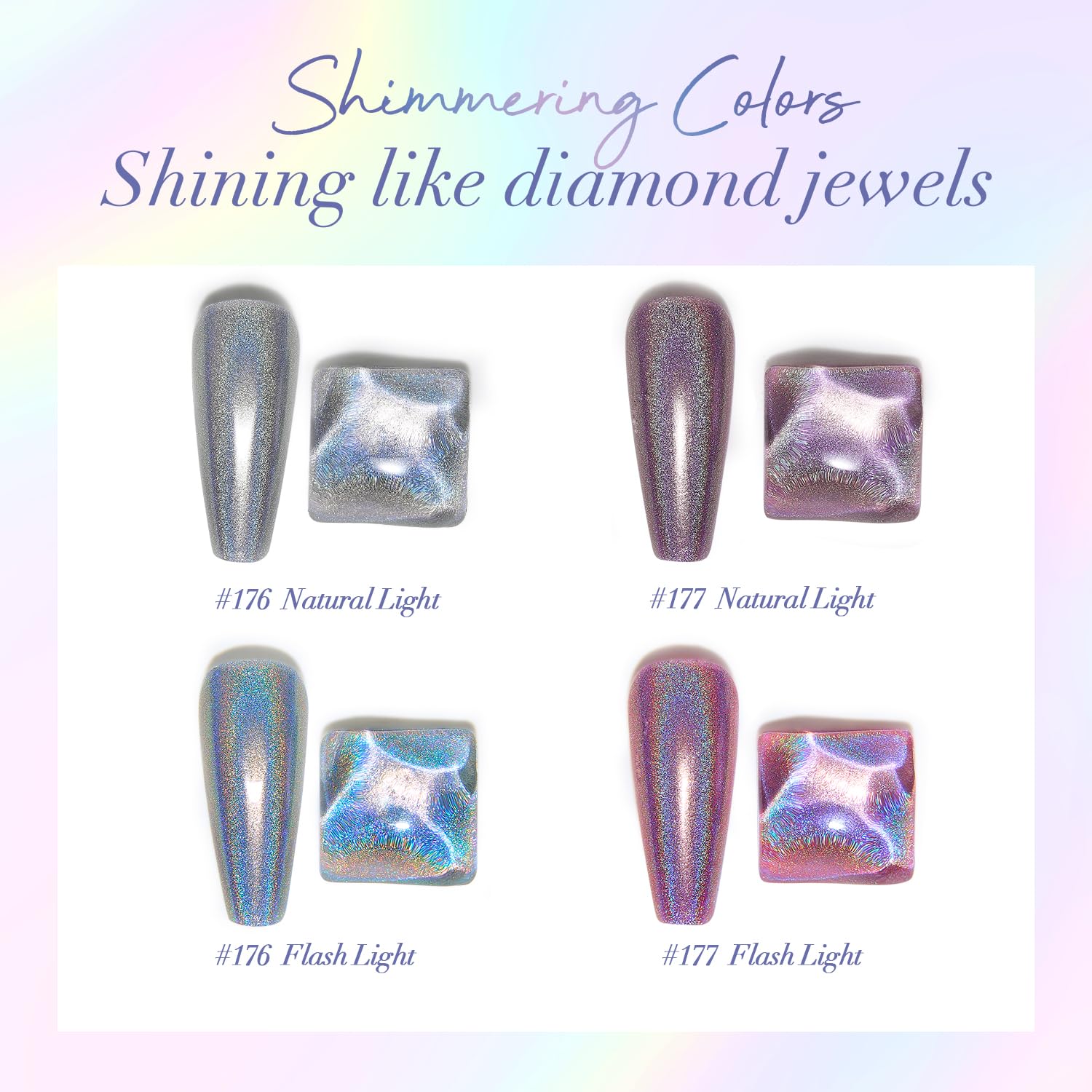 【Holographic Rainbow Nail Polish Set】 Holographic nail polish glows with rainbow-like brilliance under incandescent light, shimmering like a galaxy on your nails and making your beauty shine brightly. The sparkling effect reflects light with each finger movement, adding sophistication to your fingertips and easily matching any outfit or season