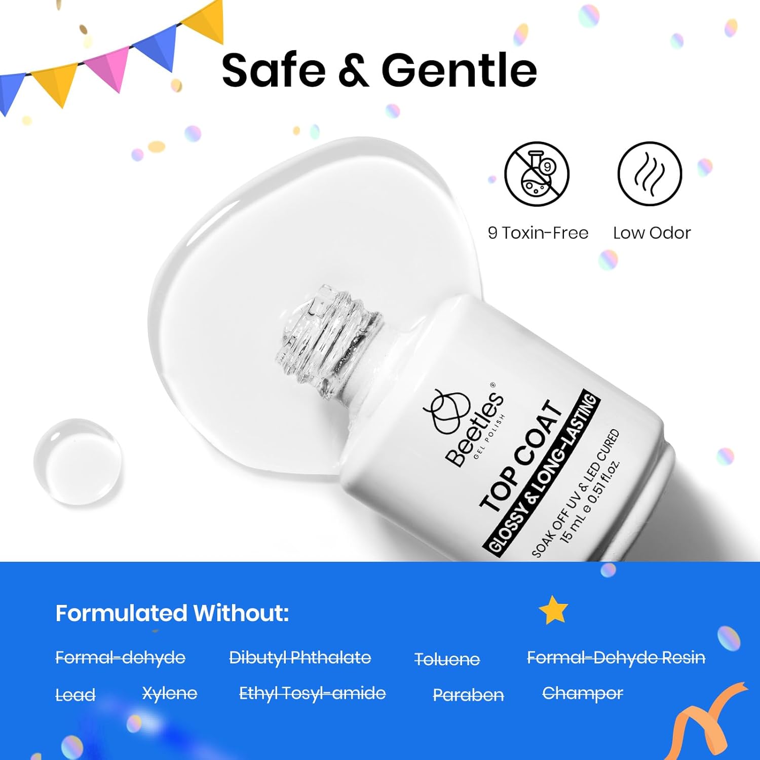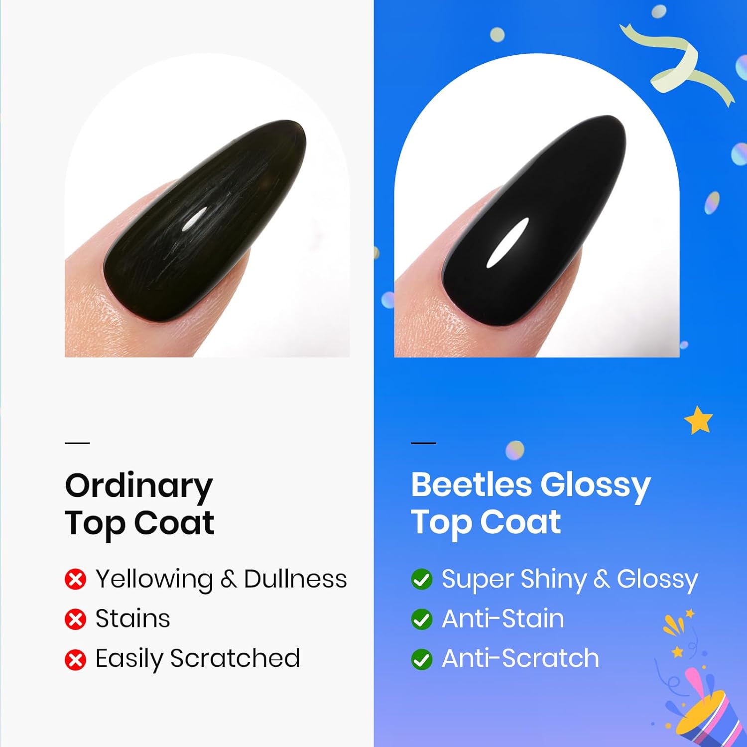Beetles Extra Glossy Top Coat: Compared with ordinary top coat gel nail polish, upgrade super shiny gel nail polish top coat is effective against stains, more abrasion-resistant, smoother, and able to resist scratches, leaving the nail surface smooth and looking brighter. Tips: Avoid touching your nails after curing the top coat for 2 minutes to enhance the shine.