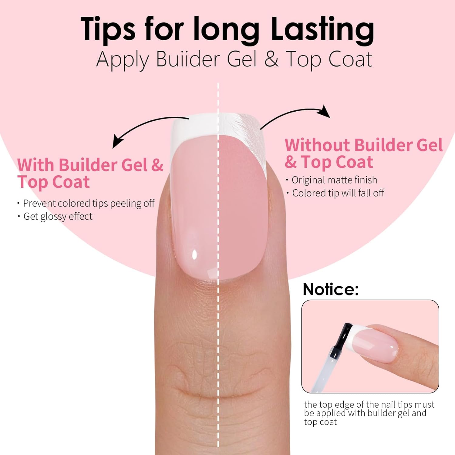 Base Nail Tips for DIY : Convenient base french nails tips come with matte finish, which can hold glue well if you like to add extra decos. If you want to get a glossy finish and keep the classic style just apply a top coat and done. This nail tips provide a cost-effective and convenient way to do manicures at home. Perfect for people who enjoy doing nails as a hobby or side business. NOTE: Glue not included You can use them with adhesive tabs for short-term wear or nail glue for longer-lasting