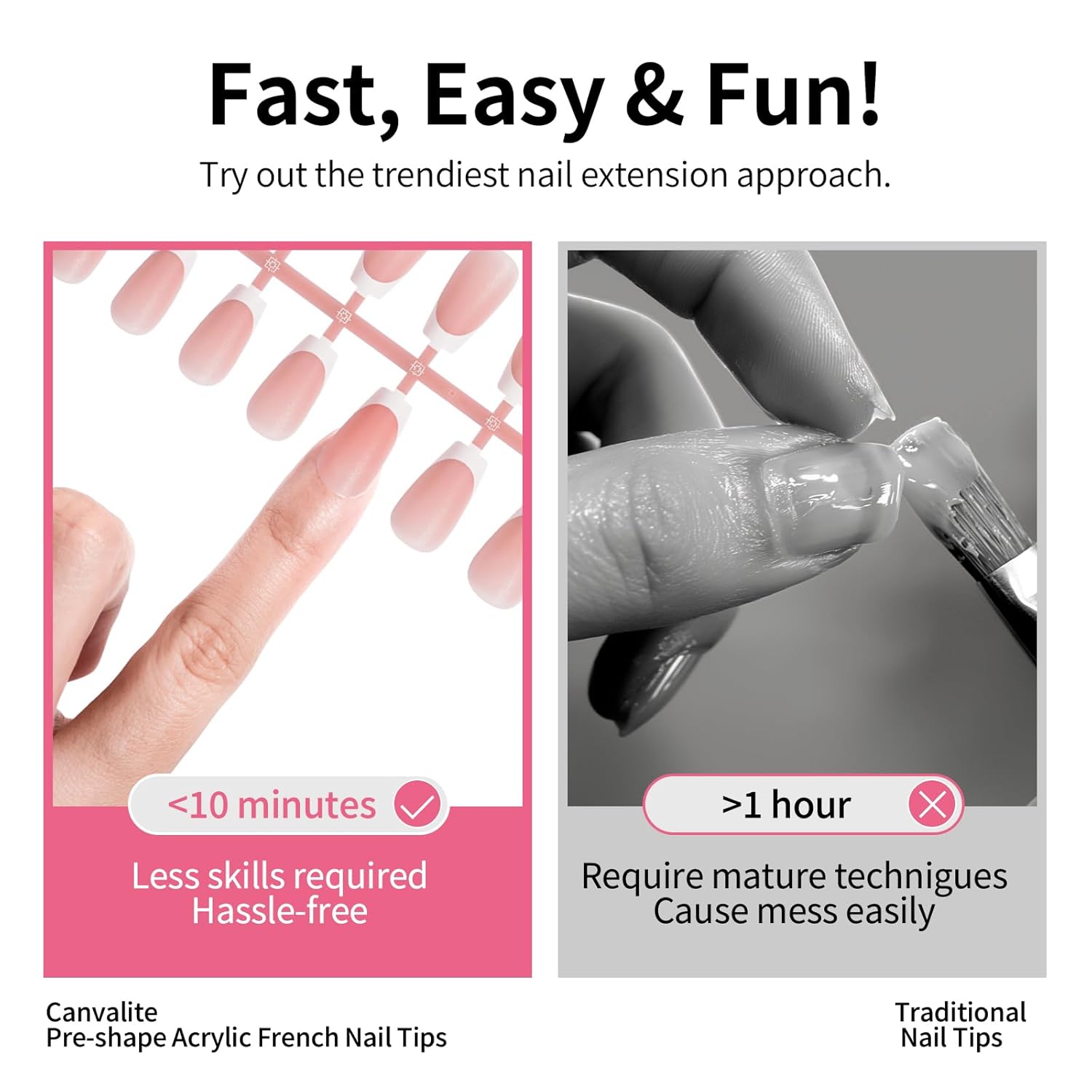 Fitting Different Finger Sizes: This french nail set offers a variety of size options to ensure a perfect fit, providing a comfortable and secure wear. They come on a strip, which makes finding your size for each nail so easy and store with no mess. One set contains enough pieces for multiple manicures, making it easy to share with friends or family. Canvalite French tip nails make a great gift for sisters or friends who love doing their nails