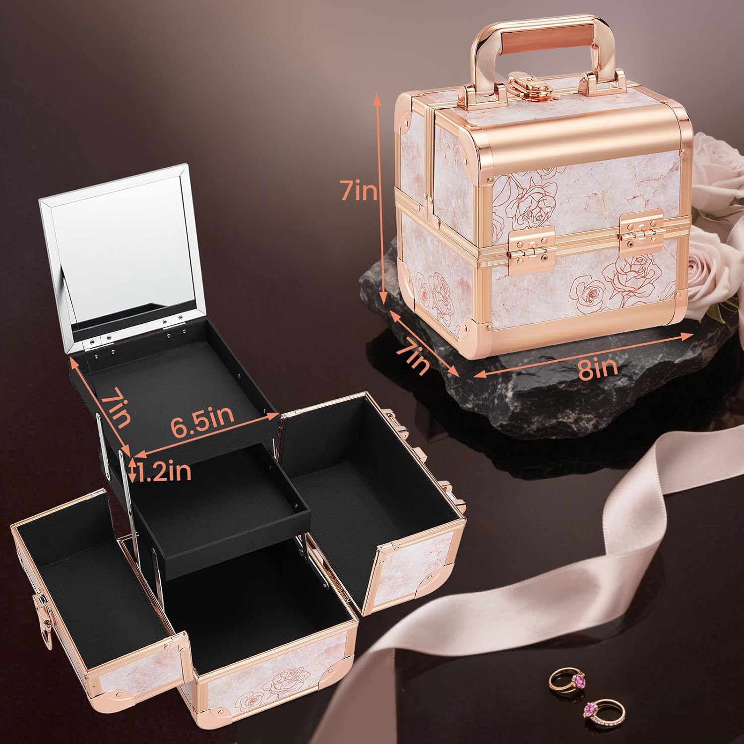 Costravio Makeup Case Train Case Portable Makeup Box with Mirror Lock Box Travel Cosmetic Train Cases Hard Make Up Organizer for Girls Nail Craft Storage Vanity Rose Gold Flower