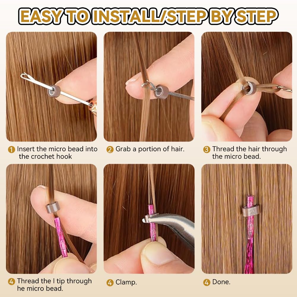 Accessory Kit:Each package contains 20 pieces of I tip tinsel hair,1 piece of crochet hook,1 piece of loop,50 pieces of beige color micro beads,50 pieces of brown micro beads.You just need to prepare a clamp is fine.