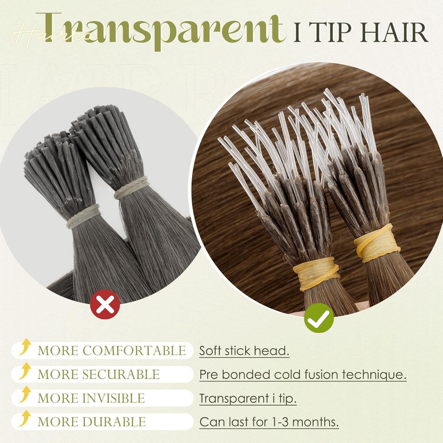 Hairro I Tip Hair Extensions Human Hair Transparent I Tips Real Hair Extensions Pre Bonded Cold Fusion Keratin Stick Tipped Hair Itips Hairpieces For Women 16 inch 50g 50S #04 Medium Brown