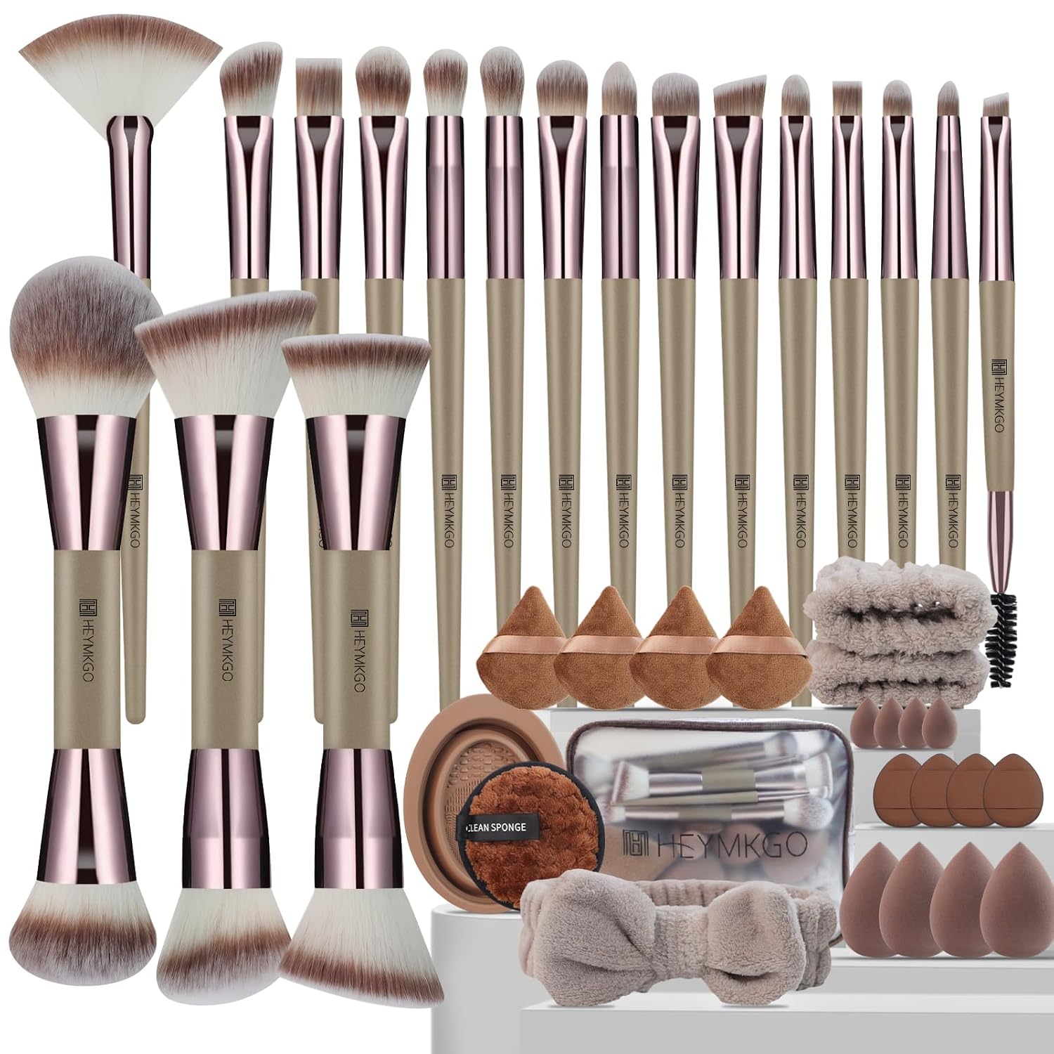 Complete 40Pcs Makeup Brushes Kit: This all-in-one makeup set includes 4 versatile dual-ended makeup brushes, 14 essential makeup brushes, 4 large makeup sponges, 4 mini makeup sponges, 4 large triangle powder puffs, 4 mini makeup puffs, 1 makeup remover puff, 1 cleaning mat, a 3pcs face-wash headband & wristband set, and a clear makeup travel toiletry bag. Designed to cover your entire beauty routine, this kit offers endless ways to mix, match, and create looks from everyday natural to full glam.
