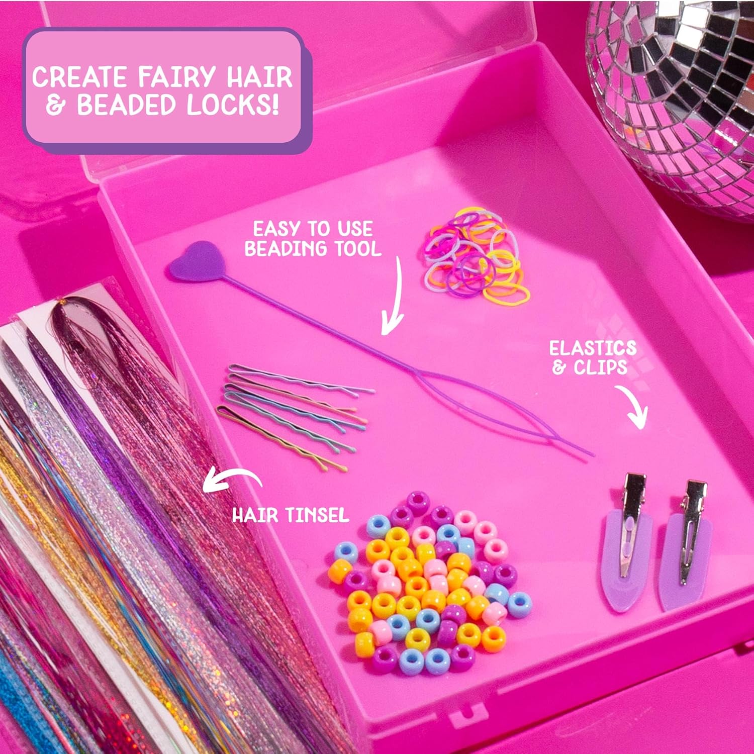 SET INCLUDES: 50 Colorful Pony Beads, 20 Colorful Hair Elastics, 1 Hair Beading Tool, 5 Hair Pins, 9 Bundles of Hair Tinsel (10 in. Long Each), 2 Hair Clips, 10 Bobby Pins, 1 Storage Case, Easy-to-Follow Project Guide