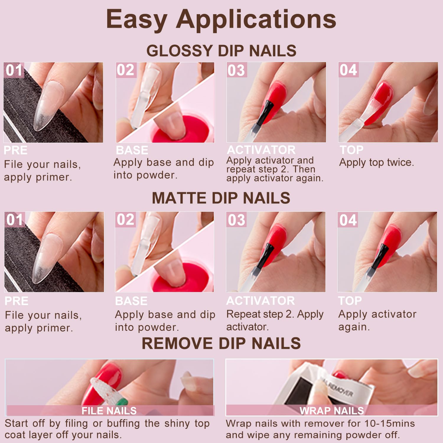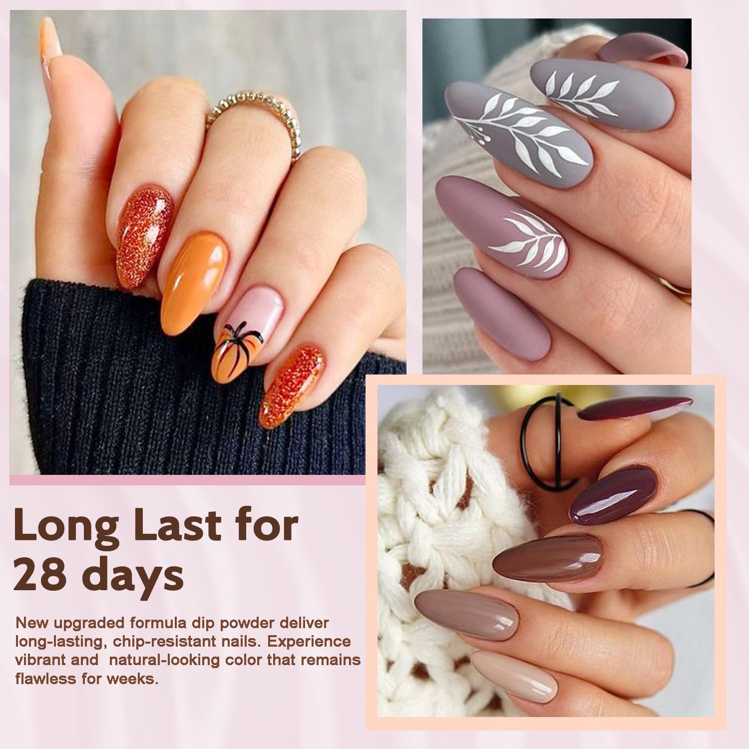 Long Lasting: Experience durable, chip-resistant nails for over 28 days with our dip powder set. Enjoy flawless nails with no breakage or peeling. This nail powder dipping kit doesn’t need a lamp.