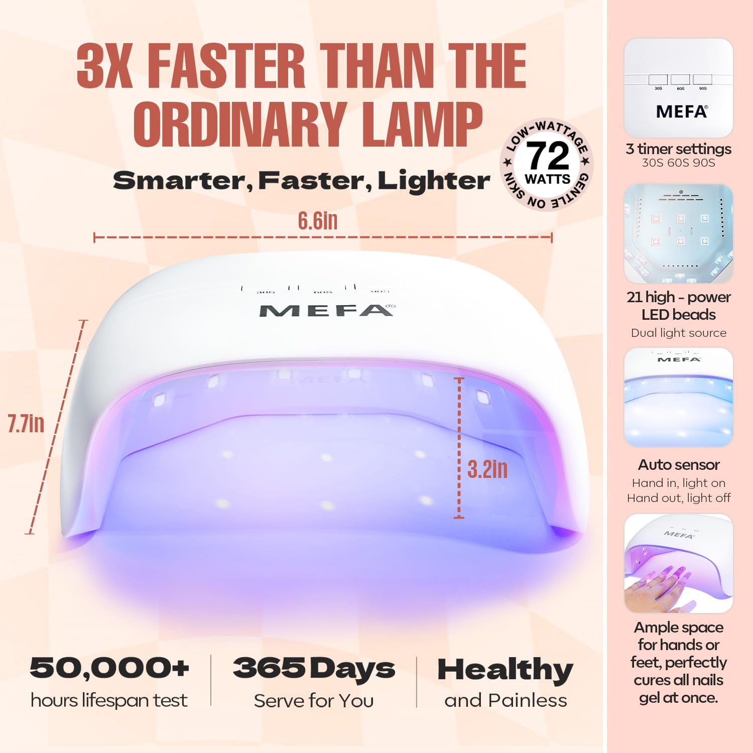 Rapid 72W Nail Lamp: The lamp dries nails efficiently with three timing settings (30s/60s/91s), save time by drying twice as fast; its automatic smart control turns on when your hand is in and off when removed, enjoy hassle-free nail art manicures