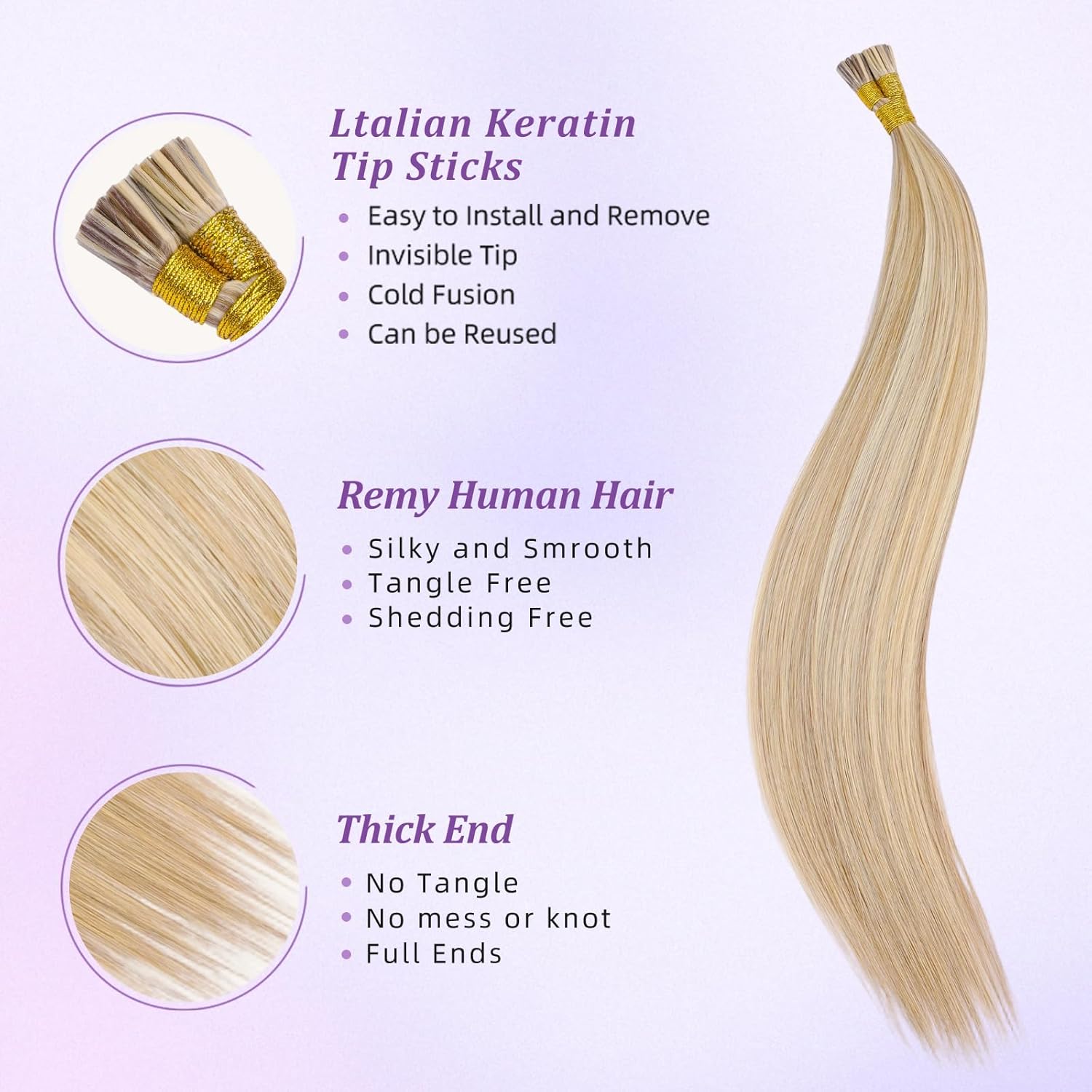 MioYio I Tip Hair Extensions Human Hair 30G/Pack Human Hair Itip Human Hair Extensions Dark Blonde to Highlighted Blonde Pre Bonded Extensions Long Straight #18/613 14Inch