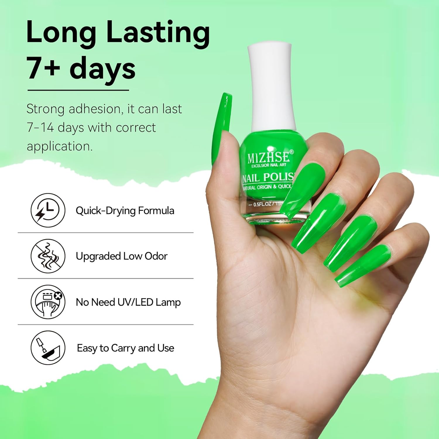 Healthy Water-based & High-Quality Ingredients: MIZHSE quick dry nail polish is crafted with high-quality and safe materials. It has almost no odor and won’t harm your nails or easily fade or peel off, making it perfect for beginners and people who like to change nail styles frequently