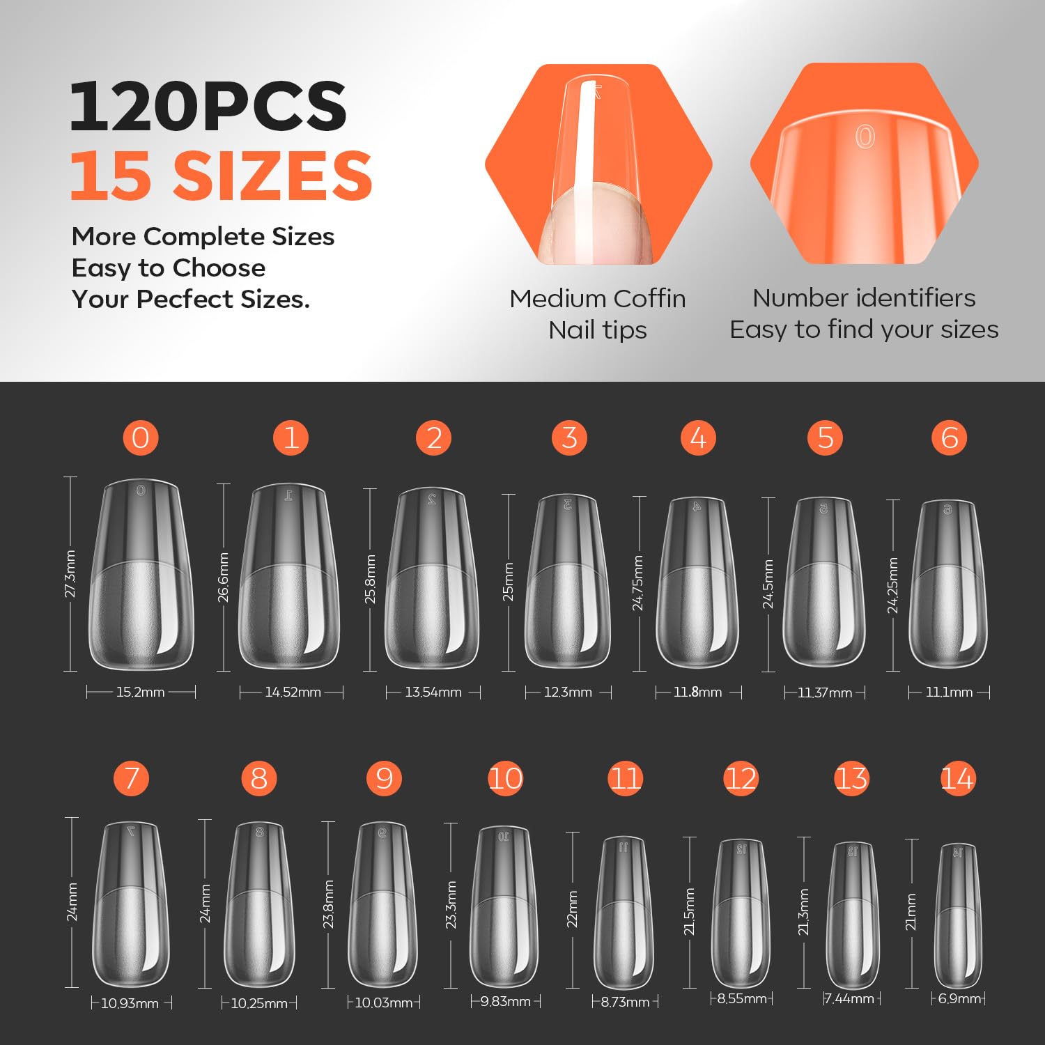 15 Size Options Suitable for Various Nail Beds: The set include 120 pcs, 15 different sizes which is individually numbered 0-14. These nails are ideal for individuals with an oval to square-shaped nail bed, ensuring a better fit, comfort, and a more natural look