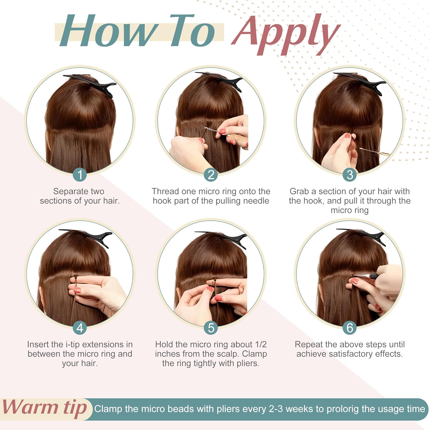 【Usage】We recommend using a microbead with silicone to connect I tip hair extensions, silicone beads have great skid resistance and will not damage your own hair. Please firm the beads every several weeks so that extend the I tip hair extensions’ useful life.