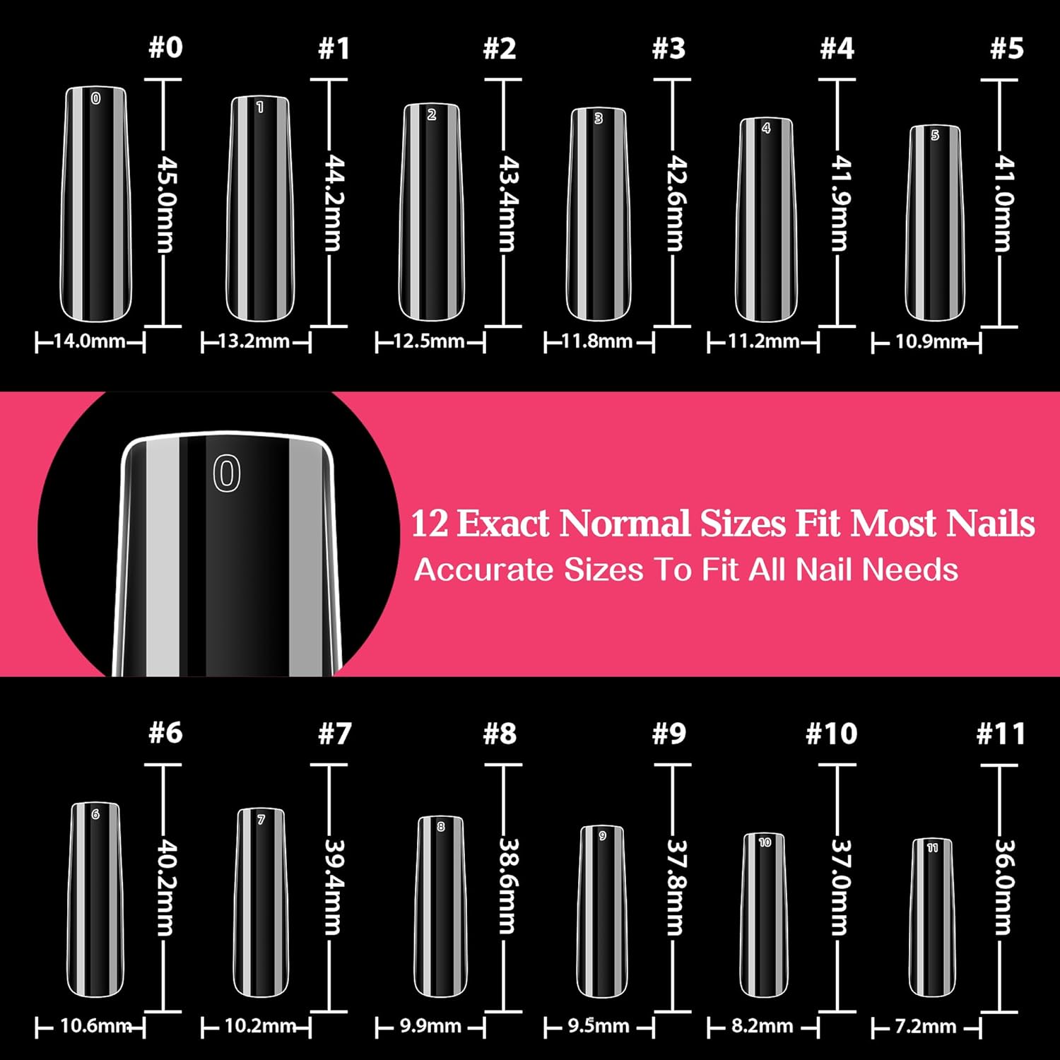 ❤️12 Sizes Full Tips Fit Your Nails: Out Extra Long straight tips contain 12 sizes with size number on the top of the tips can easy pick proper tips for your nail. Full coverage Square Straight tip with 2 extra size can suit bigger or smaller